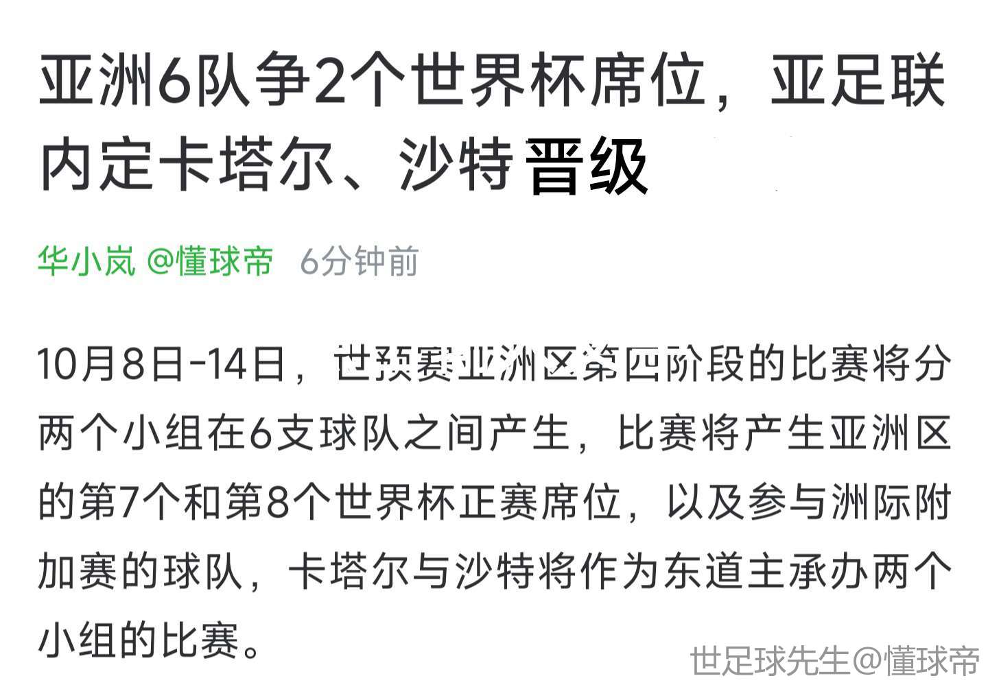 10月8日-14日,世预赛亚洲区第四阶段的比赛将分两个小组在6支球队之间产生,比赛将产生亚洲区的第7个和第8个世界杯正赛席位,以及参与洲际附加赛的球队,卡塔尔与沙特将作为东道主承办两个小组的比赛。