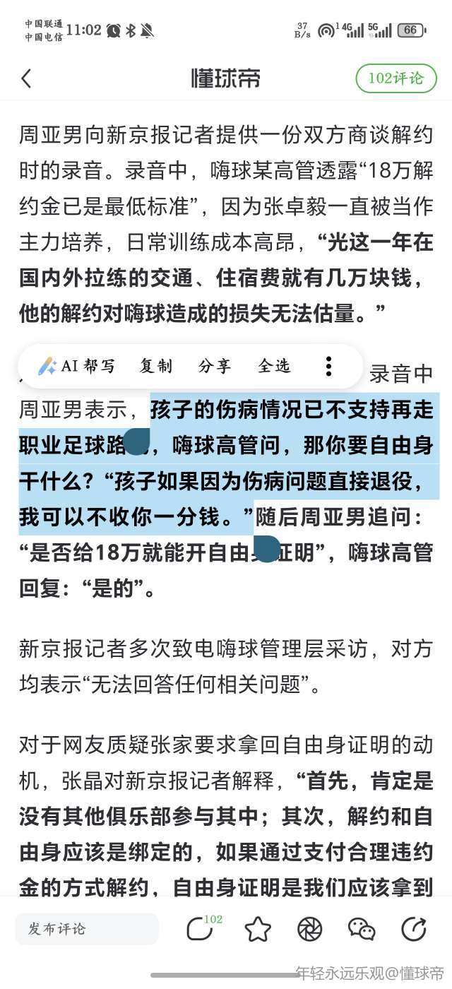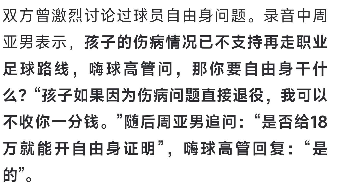 双方曾激烈讨论过球员自由身问题。录音中周亚男表示,孩子的伤病情况已不支持再走职业足球路线,嗨球高管问,那你要自由身干什么?“孩子如果因为伤病问题直接退役,我可以不收你一分钱。”随后周亚男追问:“是否给18万就能开自由身证明”,嗨球高管回复:“是的”。