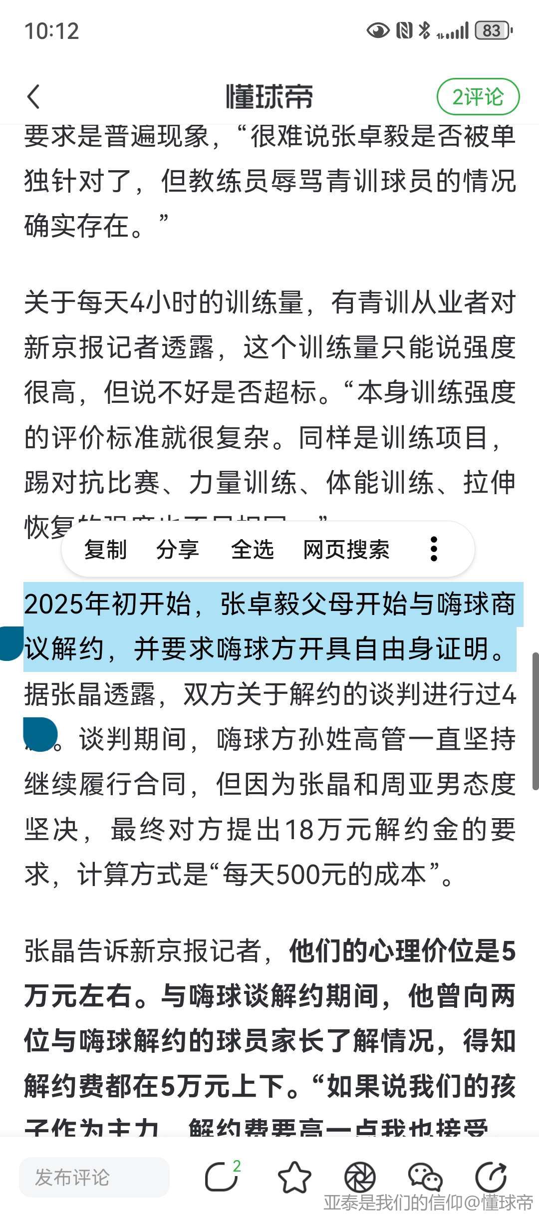 2025年初开始,张卓毅父母开始与嗨球商议解约,并要求嗨球方开具自由身证明。据张晶透露,双方关于解约的谈判进行过4次。谈判期间,嗨球方孙姓高管一直坚持继续履行合同,但因为张晶和周亚男态度坚决,最终对方提出18万元解约金的要求,计算方式是“每天500元的成本”。