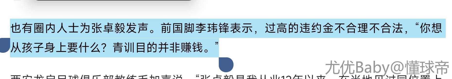 也有圈内人士为张卓毅发声。前国脚李玮锋表示,过高的违约金不合理不合法,“你想从孩子身上要什么?青训目的并非赚钱。”