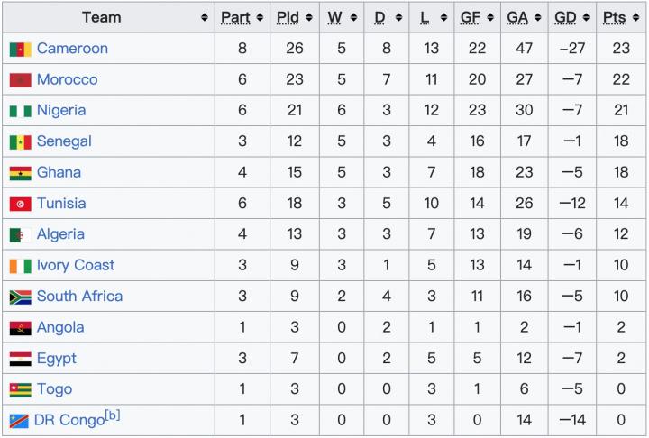 非洲没有像亚洲的日本韩国伊朗这样的洲际超级强国,当然这跟非洲政治局势极端不稳定有关系,大量的优秀球星选择了加入他国国籍(法国,比利时,英国,葡萄牙最多)。