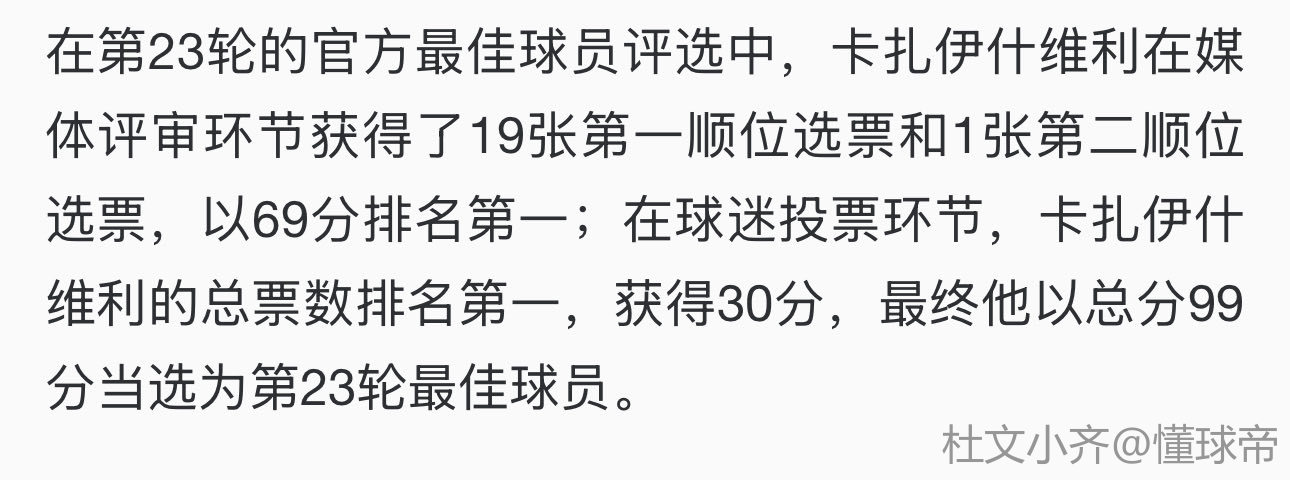 在第23轮的官方最佳球员评选中,卡扎伊什维利在媒体评审环节获得了19张第一顺位选票和1张第二顺位选票,以69分排名第一;在球迷投票环节,卡扎伊什维利的总票数排名第一,获得30分,最终他以总分99分当选为第23轮最佳球员。