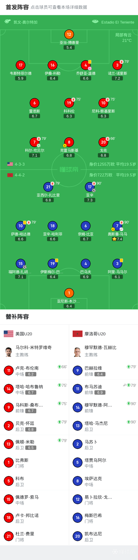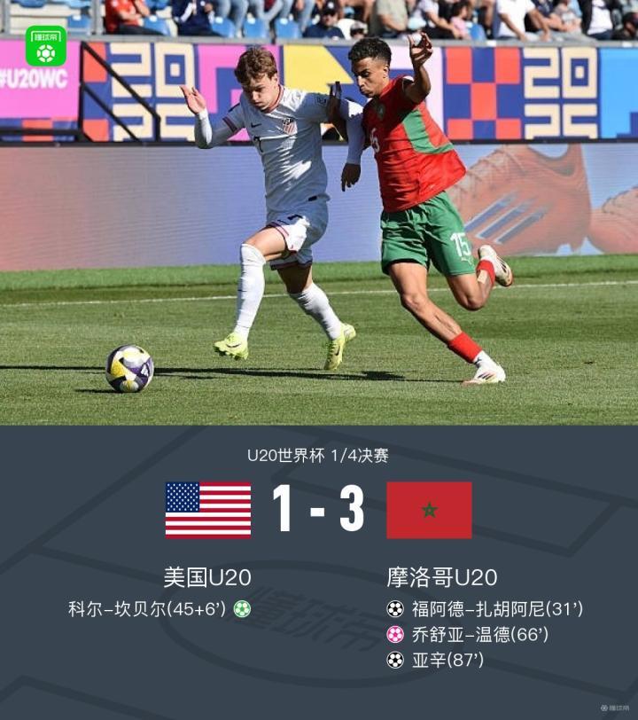 北京时间10月13日U20世界杯 1/4决赛,美国U20对阵摩洛哥U20。美国U20科尔-坎贝尔破门,乔舒亚-温德自摆乌龙。摩洛哥U20福阿德-扎胡阿尼破门,亚辛破门。最终比分美国U20 1-3 摩洛哥U20。