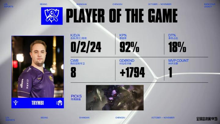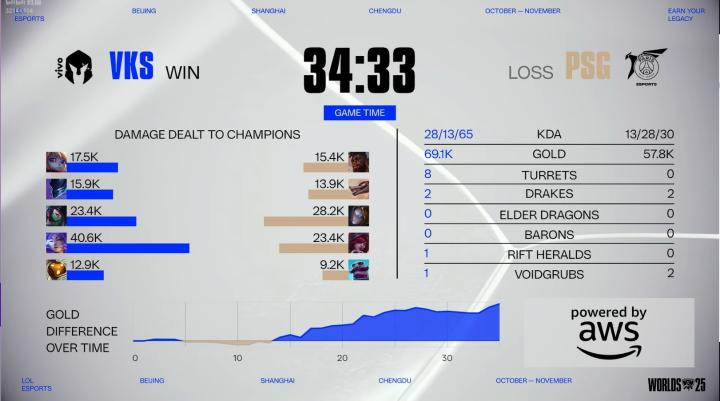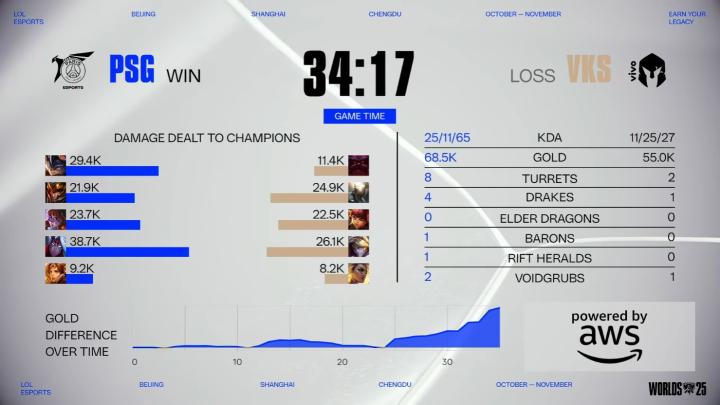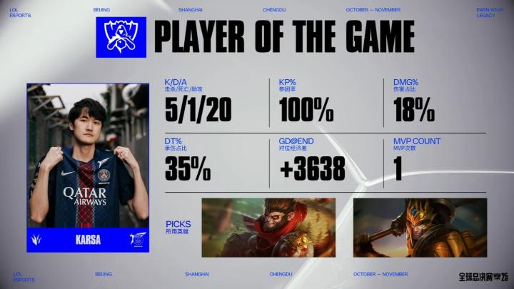 北京时间10月19日,英雄联盟S15世界赛进入瑞士轮0-2战队淘汰日。LCP三号种子PSG对战LCS二号种子VKS。本场比赛第一局VKS轻松碾压拿下,不过第二局Karsa使用皇子打出100%参团率Carry追平比分。第三局游戏中,虽然前期PSG取得小优势,但从中期开始Morttheus的芸阿娜开始接管游戏,局势瞬间逆转。随着Karsa纳亚菲利被打成超鬼,VKS成功2-1战胜PSG进入1-2池,同时宣告PSG的S15旅程到此为止。