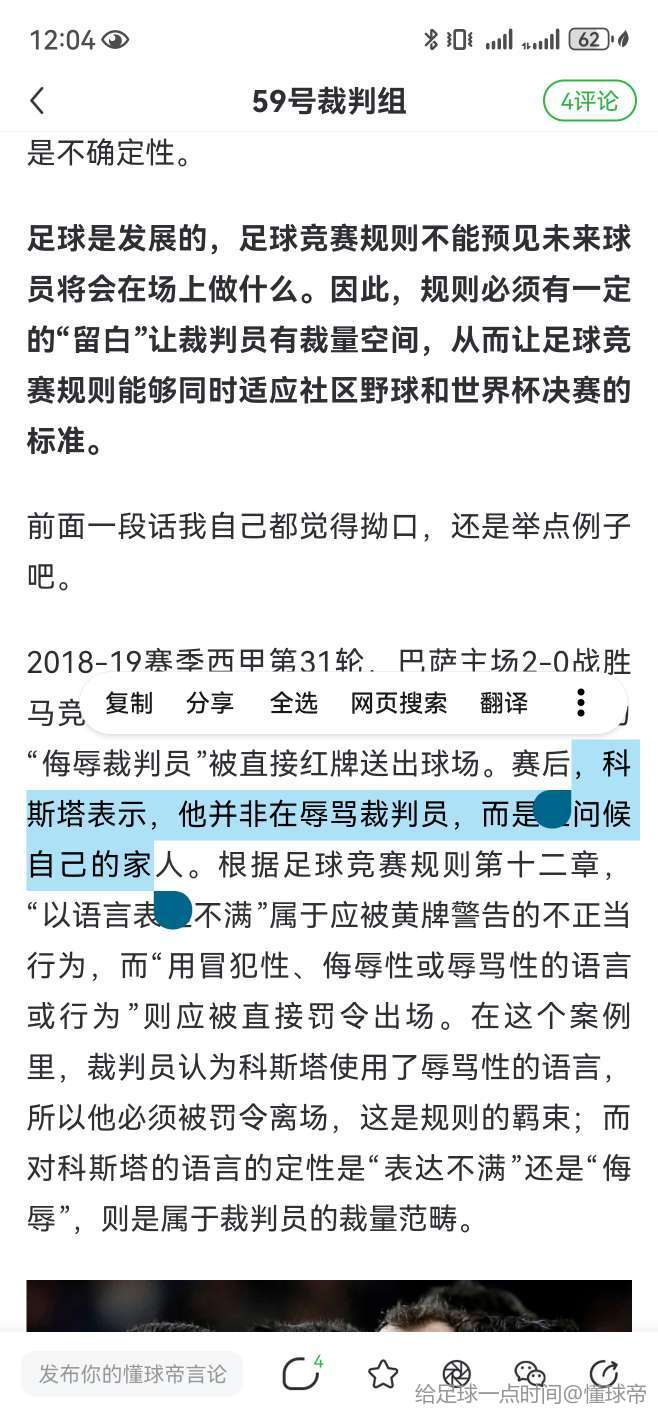 2018-19赛季西甲第31轮,巴萨主场2-0战胜马竞的比赛中,迭戈·科斯塔在第28分钟因为“侮辱裁判员”被直接红牌送出球场。赛后,科斯塔表示,他并非在辱骂裁判员,而是在问候自己的家人。根据足球竞赛规则第十二章,“以语言表达不满”属于应被黄牌警告的不正当行为,而“用冒犯性、侮辱性或辱骂性的语言或行为”则应被直接罚令出场。在这个案例里,裁判员认为科斯塔使用了辱骂性的语言,所以他必须被罚令离场,这是规则的羁束;而对科斯塔的语言的定性是“表达不满”还是“侮辱”,则是属于裁判员的裁量范畴。