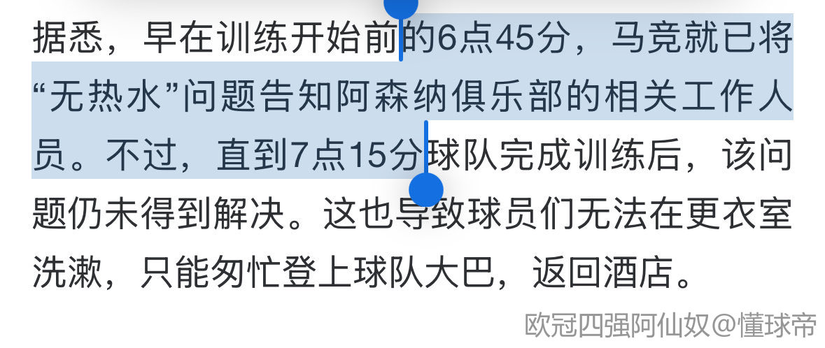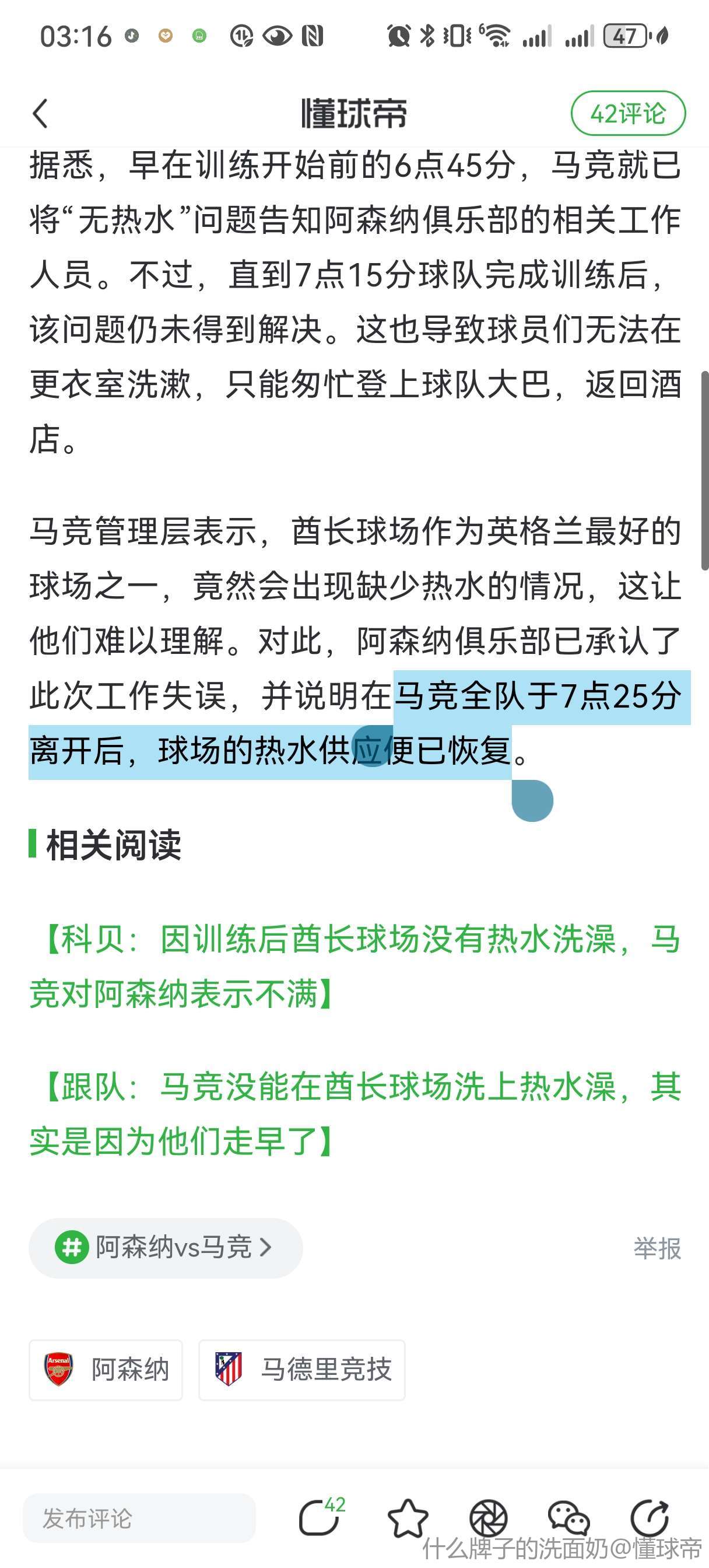阿森纳和马竞本来就没矛盾,硬是赛前场外要制造舆论流量呗。跟队说原计划7.30训练结束,提前了15分钟结束结果没热水,修好了,马竞已经提前走了。这玩意儿多大点事儿,更何况还道歉了