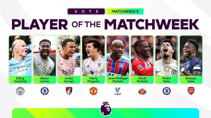 北京时间10月21日,英超官方公布了第八轮比赛的最佳球员候选名单,其中哈兰德、马奎尔、里斯-詹姆斯、萨卡、佩德罗- 内托在列。