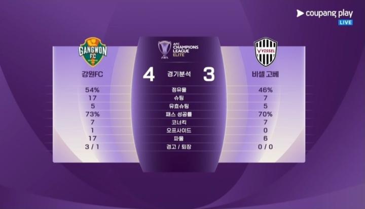 半场比赛,江原FC先后在第7分钟由李尚宪率先破门,21分钟,牟再现将比分扩大为2-0,第43分钟宋俊锡将比分变为3-0!半场结束,江原完全把日本球队打懵了。进入到下半场,日本球队开始苏醒,他们连续进球将比分迫近为2-3!尽管江原此后疯狂进攻,但牟再现接连浪费必进球,这也给了日本人扳平的机会。90分钟结束前,神户神奇将比分扳为3-3!从3-0到3-3,一般来说这是让领先一方丢士气的战役,但江原FC的球员并没有丧失斗志,反而是怒火被点燃。