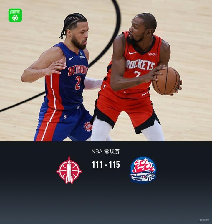 第四节火箭杜兰特拿下14分,活塞坎宁安拿下10分,最终火箭111-115不敌活塞
