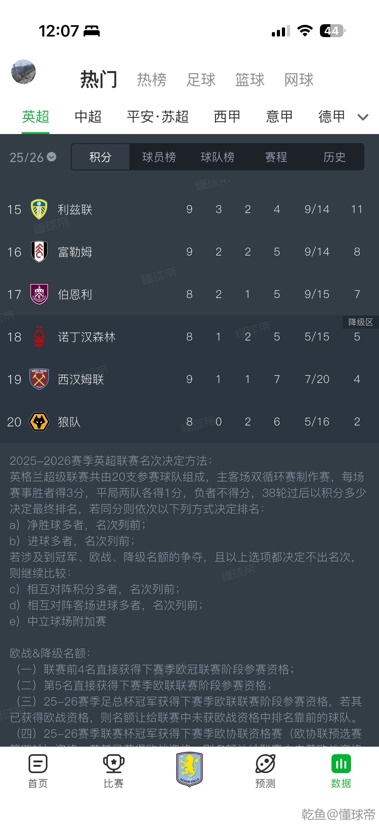 倒数三名全是努诺的东家和在职球队