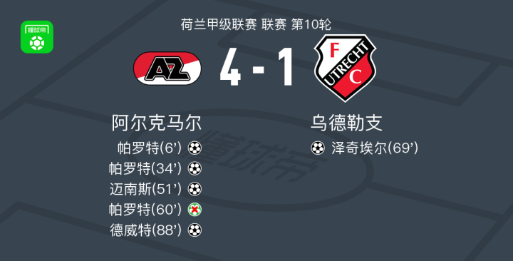 扫描下载懂球帝首页>动态> 阿尔克马尔4-1大胜乌德勒支,帕罗特双响,德威特破门