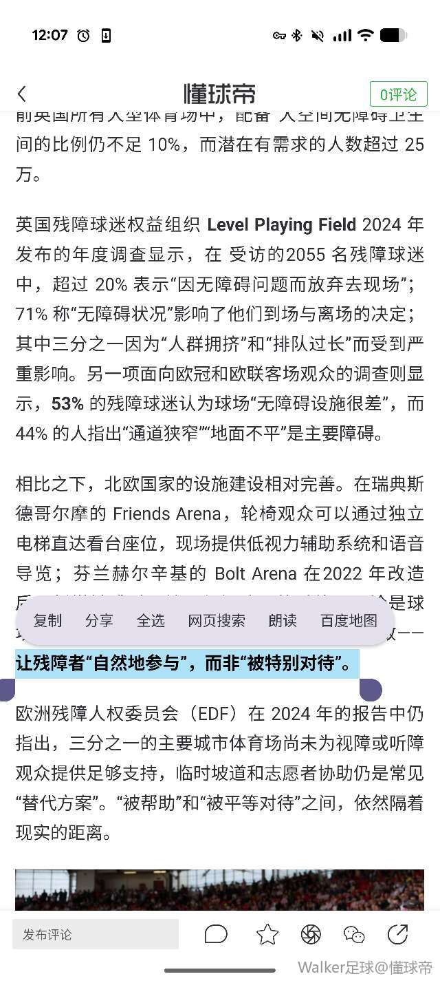 欧洲残障人权委员会(EDF)在 2024 年的报告中仍指出,三分之一的主要城市体育场尚未为视障或听障观众提供足够支持,临时坡道和志愿者协助仍是常见“替代方案”。“被帮助”和“被平等对待”之间,依然隔着现实的距离。