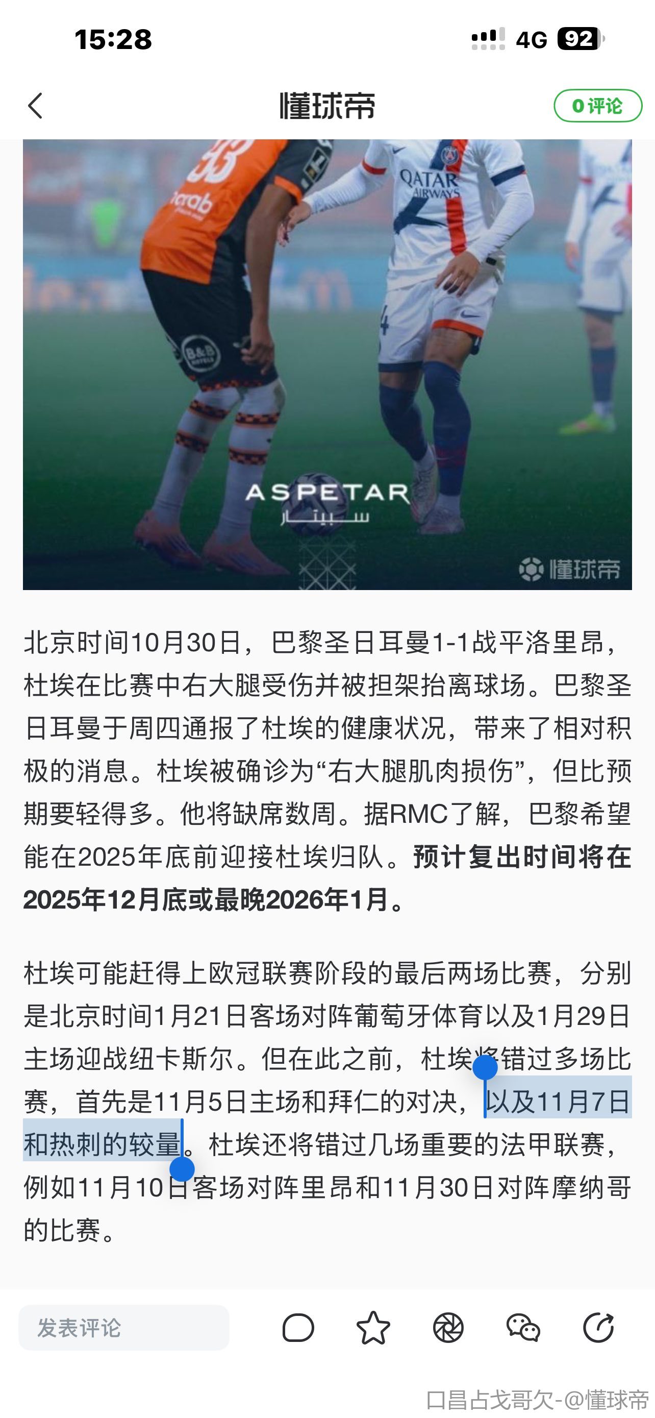 扫描下载懂球帝首页>动态> RMC:杜埃最晚明年1月复出,将缺阵主场战拜仁和热刺两场欧冠