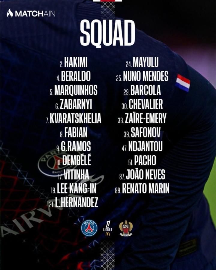 扫描下载懂球帝首页>动态> 巴黎战尼斯大名单:登贝莱领衔,阿什拉夫、法比安回归