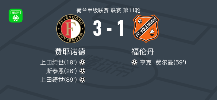 北京时间11月2日,荷兰甲级联赛第11轮,费耶诺德主场迎战福伦丹。比赛开始后,费耶诺德率先打破僵局,吉瓦伊罗-里德送出助攻,上田绮世破门得分。随后,斯泰恩接队友传球再下一城,帮助球队扩大领先优势。下半场,福伦丹由亨克-费尔曼扳回一球,一度燃起追分希望。临近终场前,黄仁范送出精准助攻,上田绮世再次破门完成梅开二度。最终,费耶诺德以3比1战胜福伦丹。