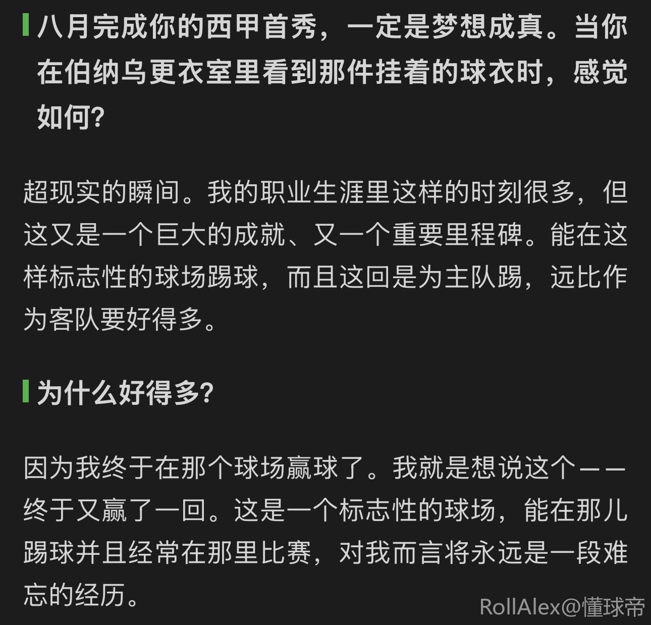 超现实的瞬间。我的职业生涯里这样的时刻很多,但这又是一个巨大的成就、又一个重要里程碑。能在这样标志性的球场踢球,而且这回是为主队踢,远比作为客队要好得多。