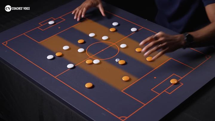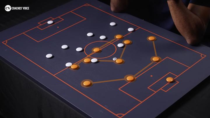 他要求我们始终保持斜线传球和斜向接球的意识。这样你在接球时就能直接完成下一脚传球,或进行一对一,从而为球队创造优势。占据正确的区域能让你更清楚地看到对手的站位。我们必须时刻去寻找他们背后的“肩部空间”。稍微前提一点,就能在有利位置接球、传出致命一脚。