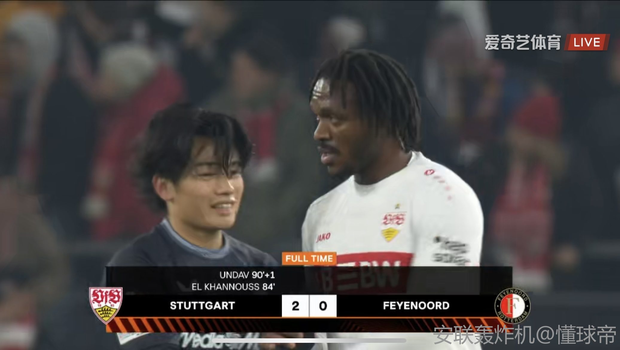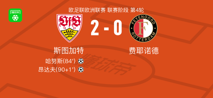 斯图加特2-0费耶诺德,哈努斯建功,昂达夫锁定胜局