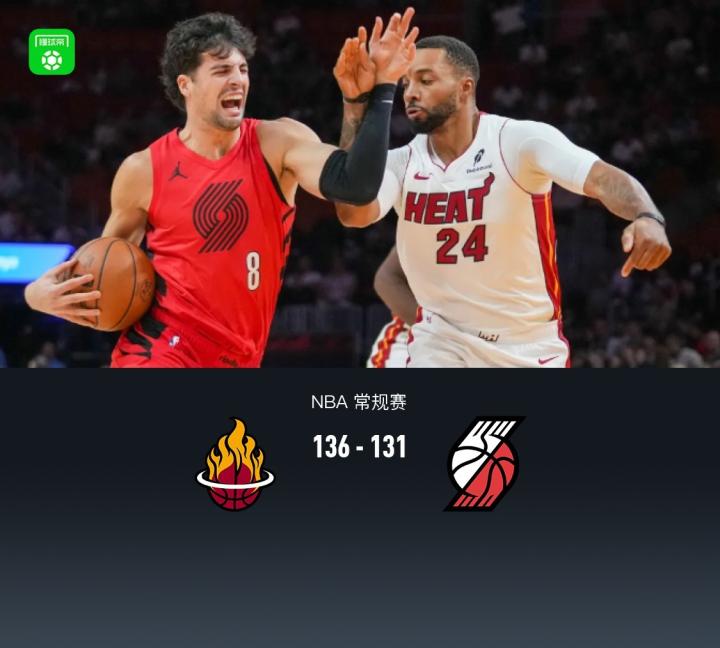 北京时间11月9日NBA常规赛,迈阿密热火背靠背主场迎战波特兰开拓者。本场杨瀚森依旧没有得到出场机会,开场开拓者取得15-3梦幻开局,随后继续快节奏对攻,热火依靠持续高效反击追反超比分,半场热火72-65开拓者,下半场热火一度领先两位数,开拓者阿夫迪亚领衔反扑追平比分,比赛最后2分钟关键时刻双方战平分,开拓者进攻哑火,热火鲍威尔、维金斯相继得分确立胜局,最终热火136-131开拓者。