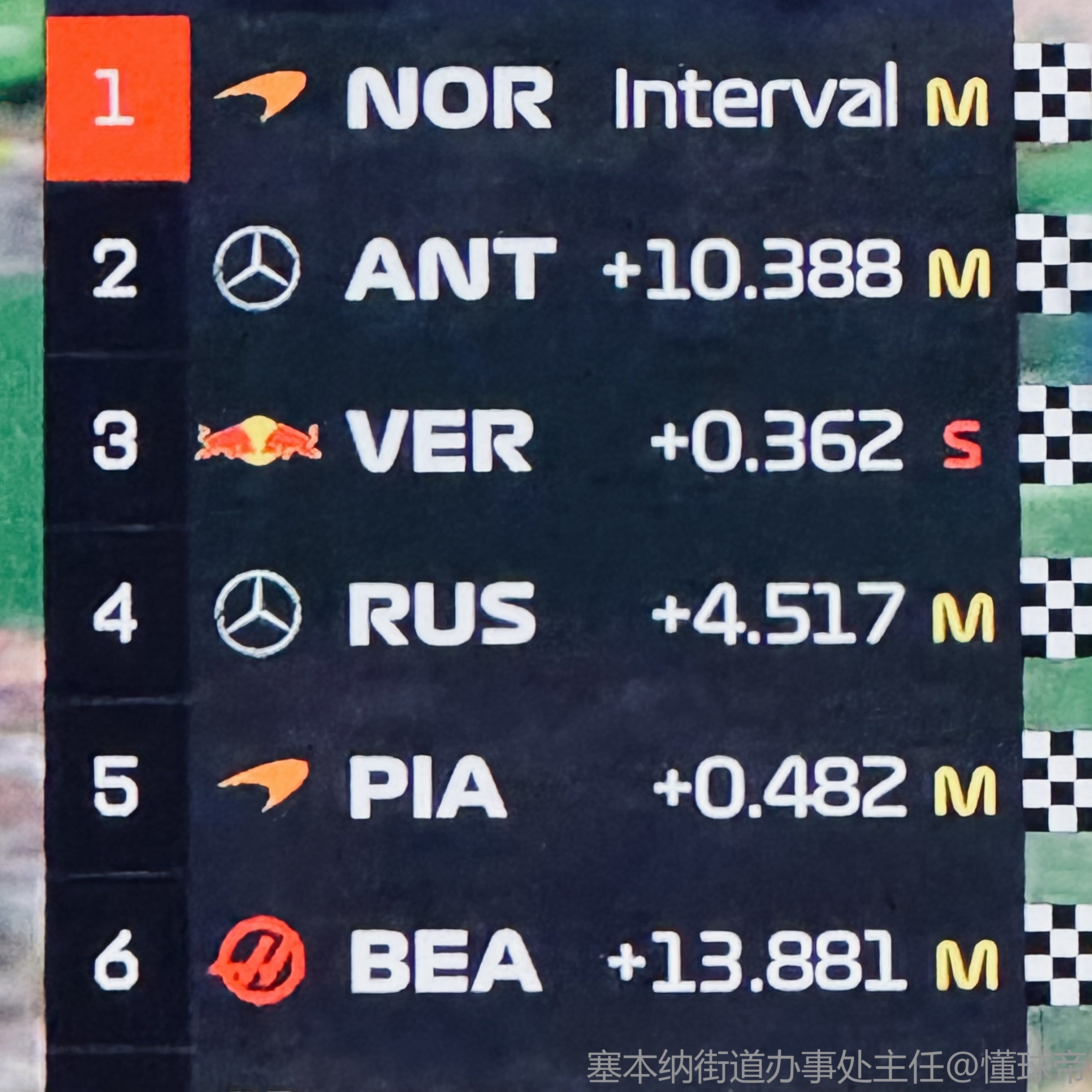 最终诺里斯将优势保持到最后,杆位夺冠。安东内利第2,维斯塔潘维修区起步拿到第3,拉塞尔第4,皮亚斯特里第5。