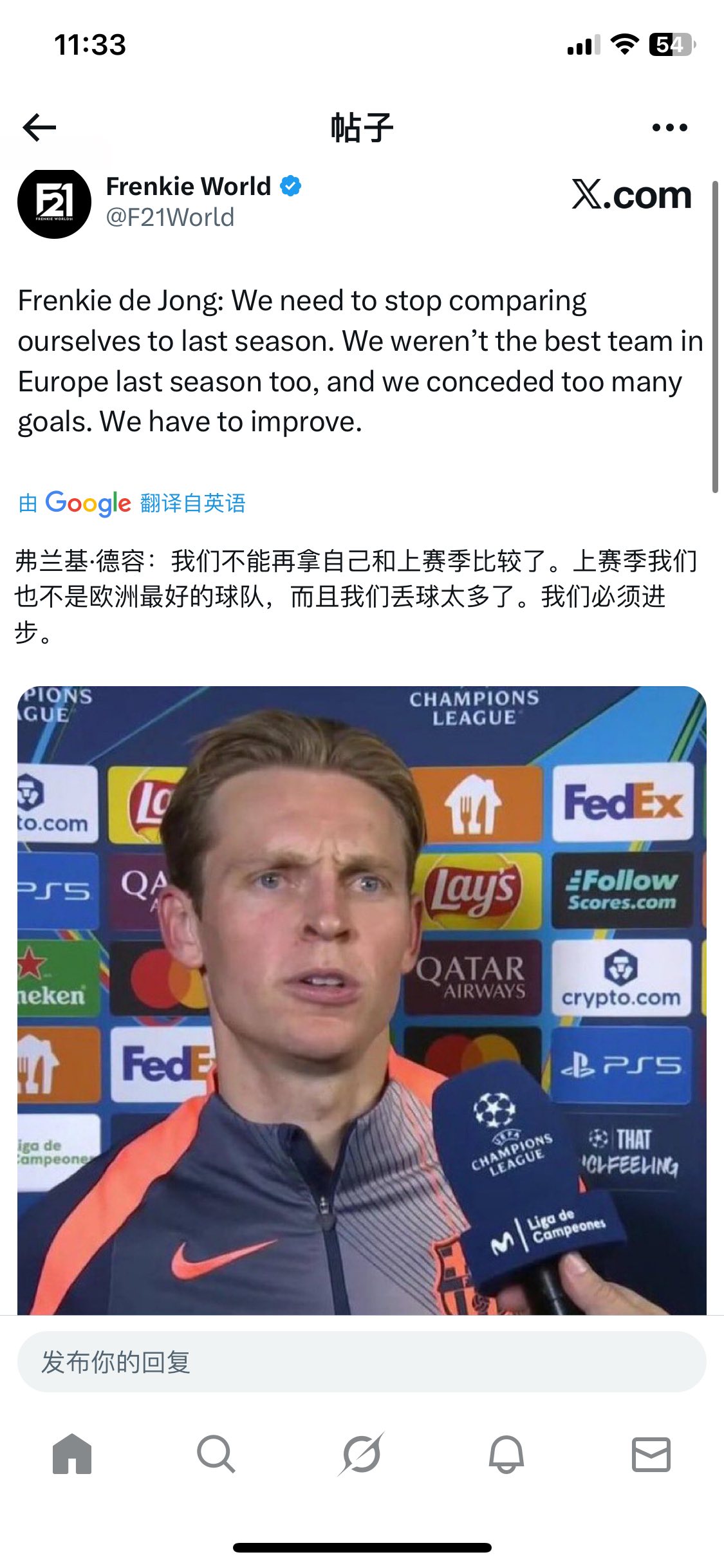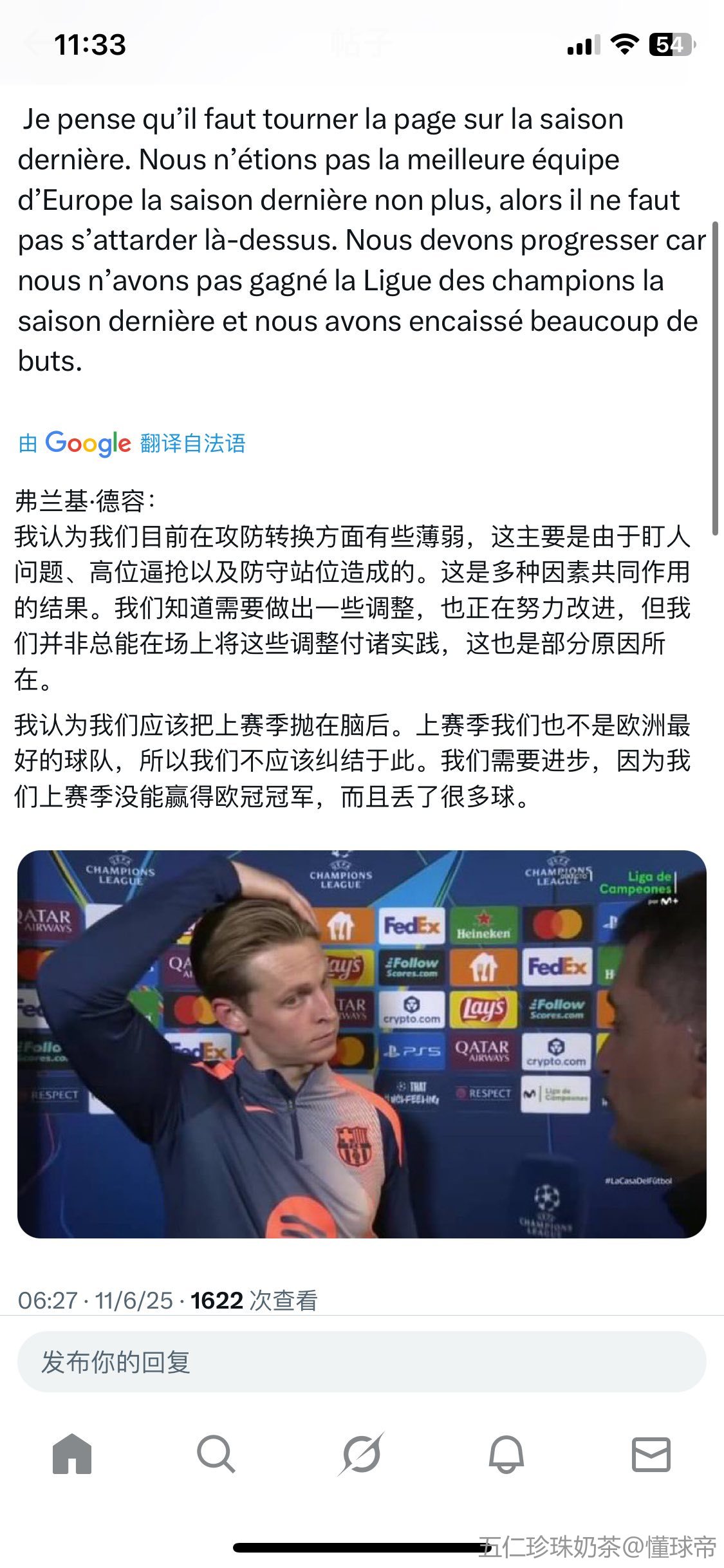 怎么都在说球员质疑战术,也没有看见相关采访,你们是在哪里看的?德容说的不是要进步也没有质疑战术