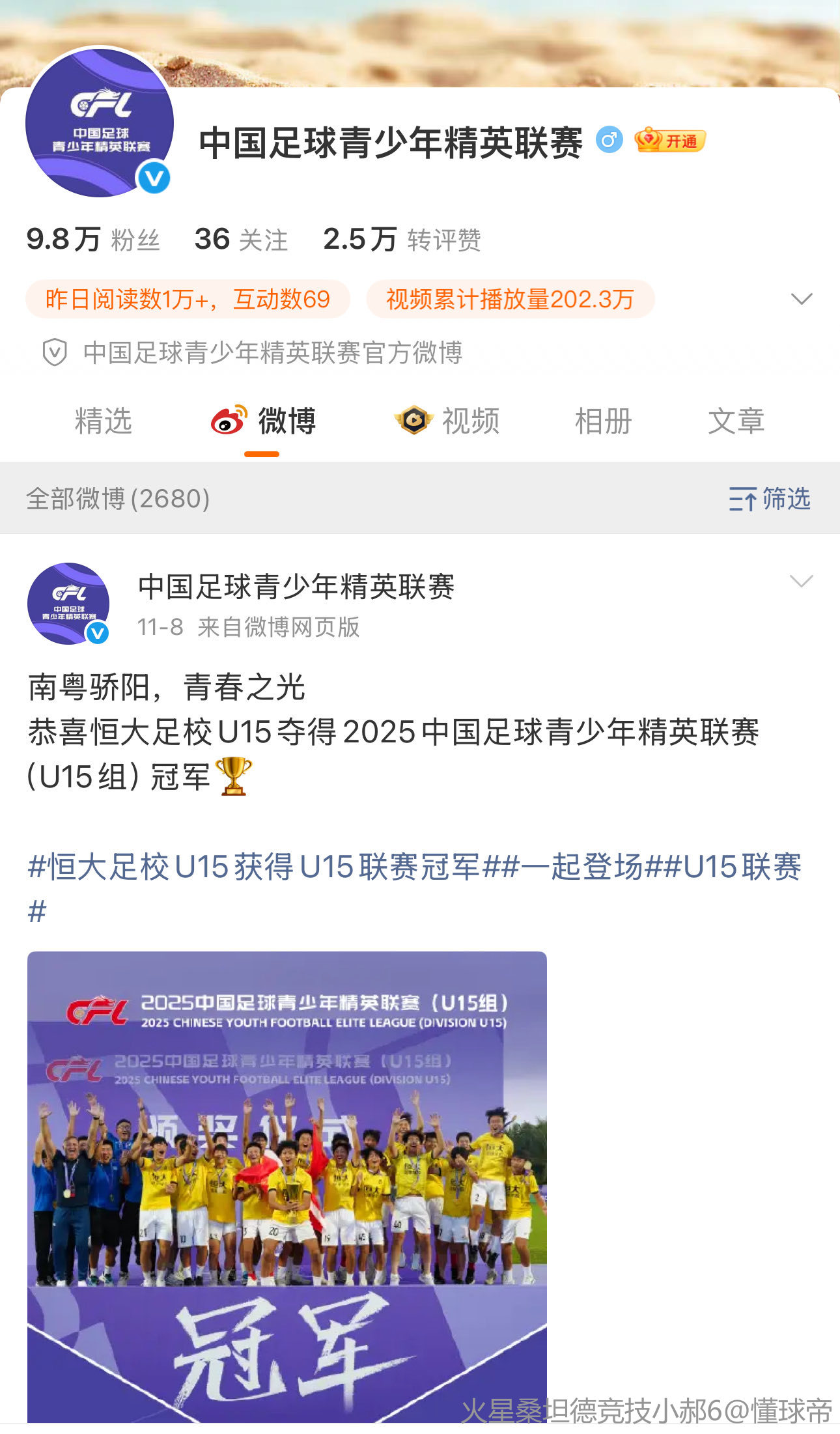 “中青赛”和“精英联赛”都有官方账号,还有直播、录像,有很多人关注,大家真可以支持一下。