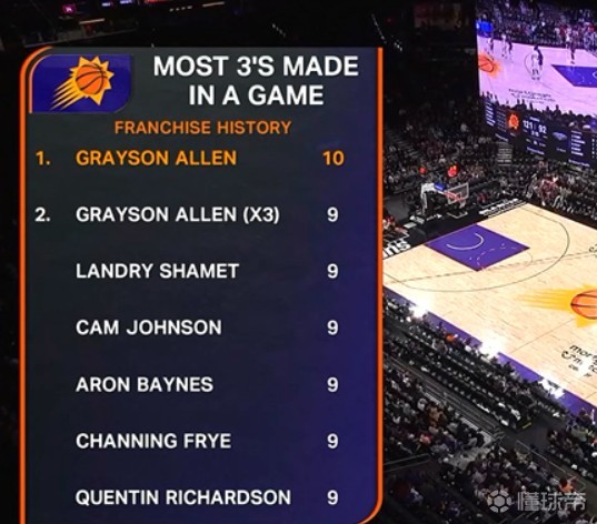 值得一提的是,42分的得分刷新了阿伦个人职业生涯的得分纪录,此前他的得分纪录是2019年效力爵士时得到的40分。此外,阿伦单场10记三分也打破了队史的三分纪录,此前太阳队的单场三分纪录为9个。