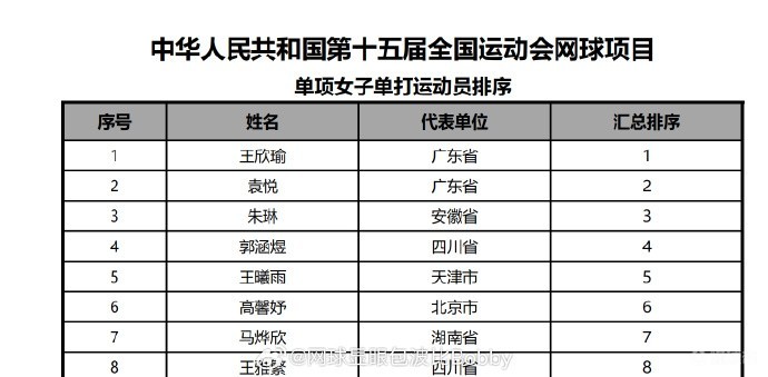 北京时间今日,全运会官方公布了网球女单项目的运动员排序,其中郑钦文已经不在名单之中,确认退出本届全运会女单赛事。