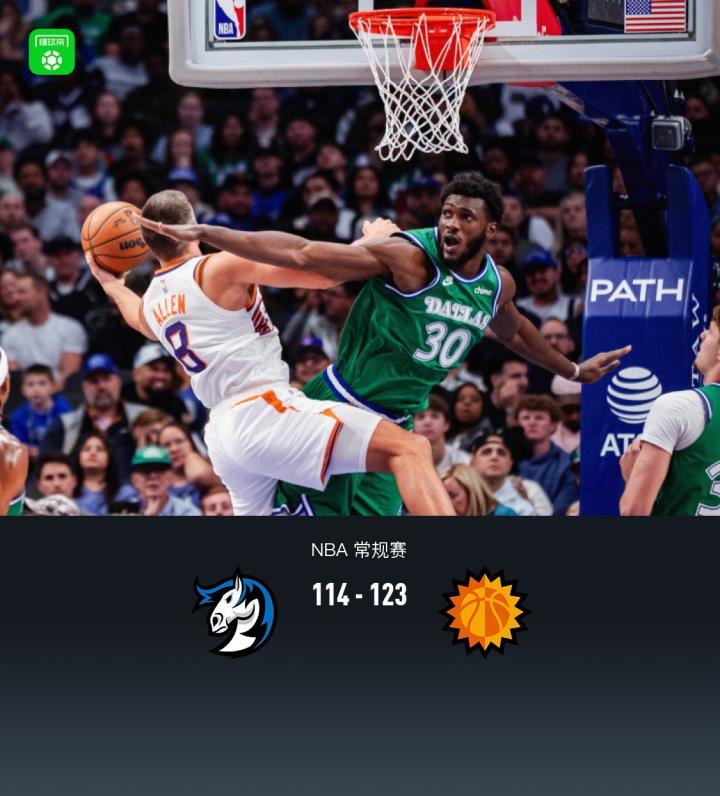 扫描下载懂球帝首页>动态> 独行侠114-123不敌太阳掉至西部倒二,布克24+9,阿伦23分