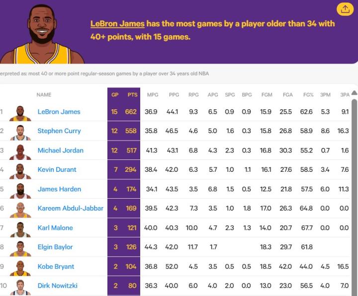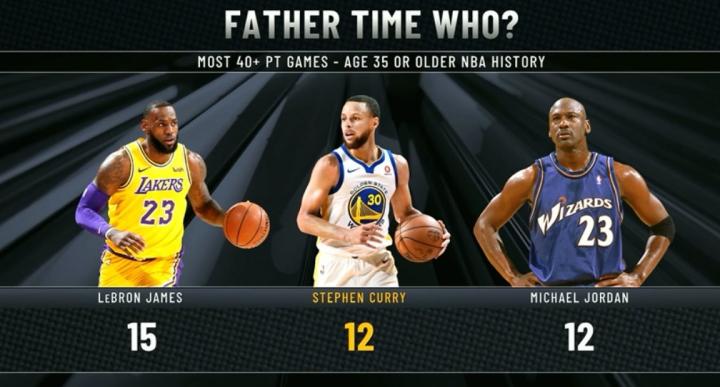 扫描下载懂球帝首页>动态> 35岁后40+得分榜:库里12次追平乔丹并列第二,第一詹姆斯15次