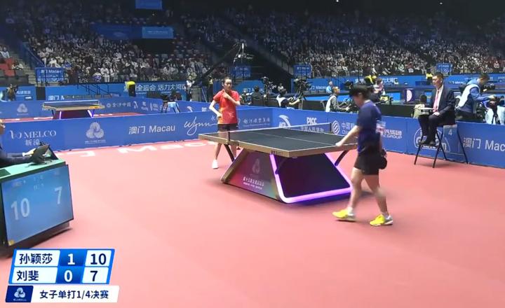 11月13日,全运会乒乓球女子单打1/4决赛,孙颖莎4-0(11-1、11-7、11-4、11-9)战胜刘斐,强势晋级女单4强。半决赛,孙颖莎将对阵朱雨玲。