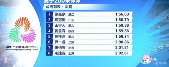 11月15日,全运会游泳男子200米仰泳决赛,徐嘉余1分56秒63夺得金牌,收获个人全运会的第15枚金牌,陶冠男1分58秒79获得银牌,王宇天1分59秒38获得铜牌。