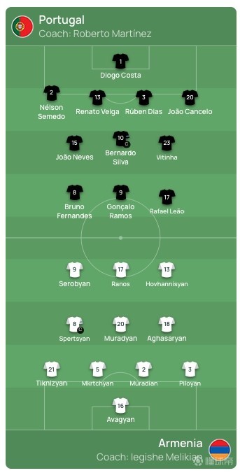 扫描下载懂球帝首页>动态> 葡萄牙vs亚美尼亚:C罗停赛,莱奥、B费、B席首发出战