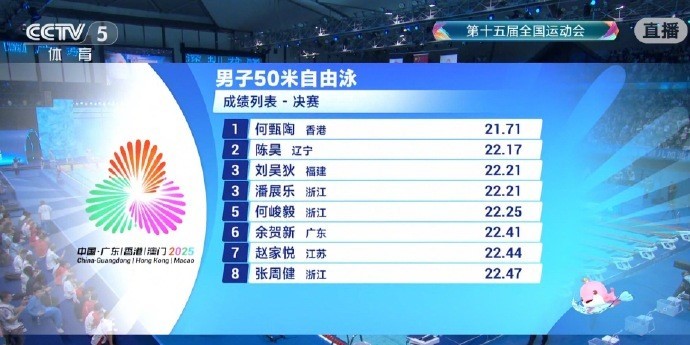 11月16日,全运会50米自由泳决赛,潘展乐以22秒21的成绩和刘吴狄并列获得铜牌。中国香港选手何甄陶游出21秒71夺得金牌,陈昊获得银牌。