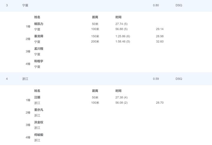 官网成绩单上显示,宁夏队前两棒有成绩,浙江队只有第一棒汪顺有成绩。