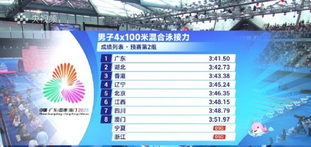 11月17日,全运会男子4x100米混合泳接力预赛中,夺冠热门浙江队以及宁夏队犯规无缘进入到决赛。
