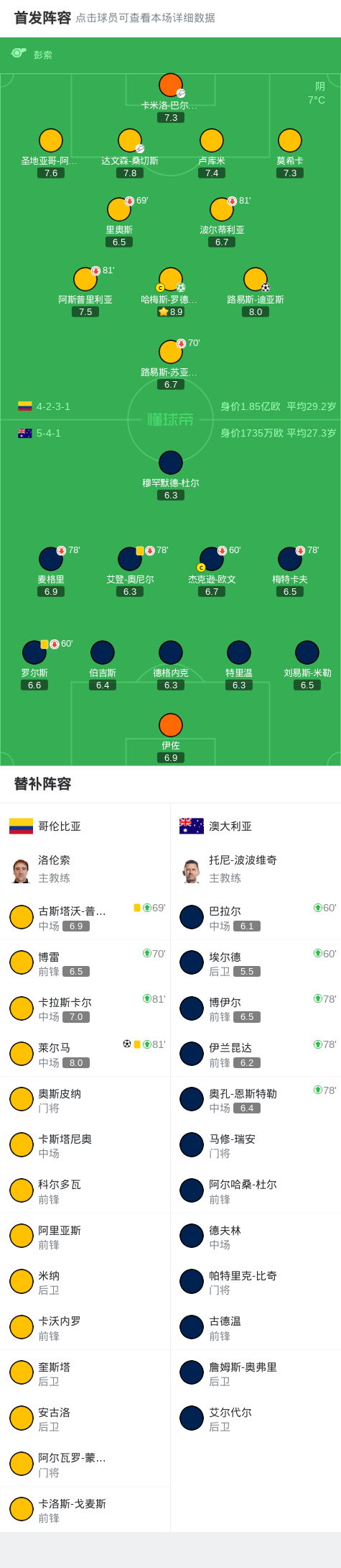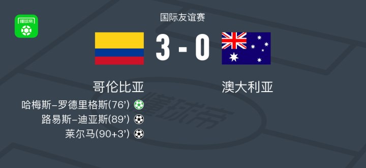 国际友谊赛,哥伦比亚对阵澳大利亚。比赛中,哈梅斯-罗德里格斯主罚点球命中,为球队首开纪录。随后,卡米洛-巴尔加斯送出助攻,路易斯-迪亚斯接球后破门得分,扩大领先优势。下半场补时阶段,达文森-桑切斯精准传球,莱尔马把握机会再入一球。最终,哥伦比亚以3-0战胜对手。