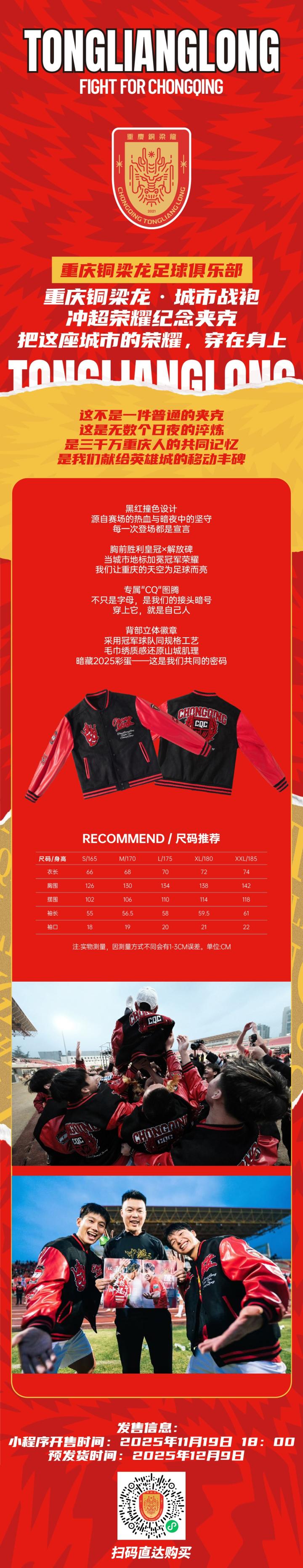 重庆铜梁龙推出冲超荣耀纪念夹克:售价499元,今晚18:00预售