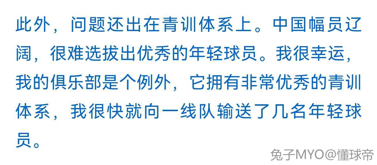 此外,问题还出在青训体系上。中国幅员辽阔,很难选拔出优秀的年轻球员。我很幸运,我的俱乐部是个例外,它拥有非常优秀的青训体系,我很快就向一线队输送了几名年轻球员。