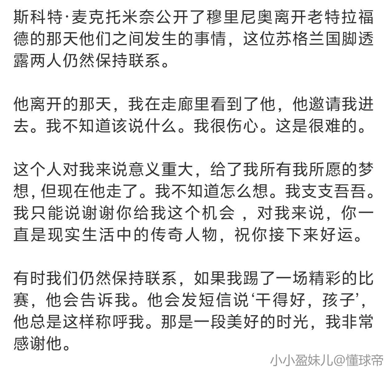 麦克利什随后联系穆里尼奥:“12点过来,一起吃午餐聊聊麦克托米奈,然后让他进到房间里。”穆里尼奥非常配合。麦克利什觉得麦克托米奈心中已有决定,他也明确表示想代表苏格兰。麦克利什说,这次拜访是他职业生涯中最值得的之一。