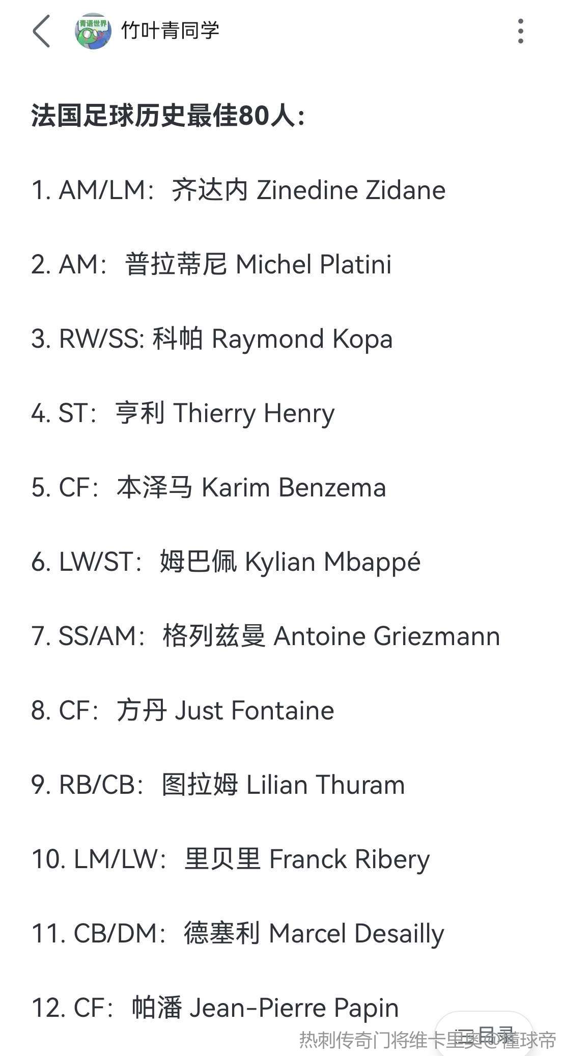 从能力,表现,影响力,成绩,这4个纬度目前来说,我排:普拉蒂尼,齐达内,方丹,德尚,姆巴佩。当然姆巴佩还年轻,未来还有无限可能。