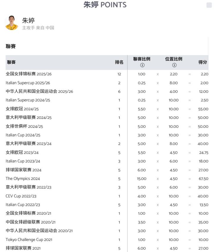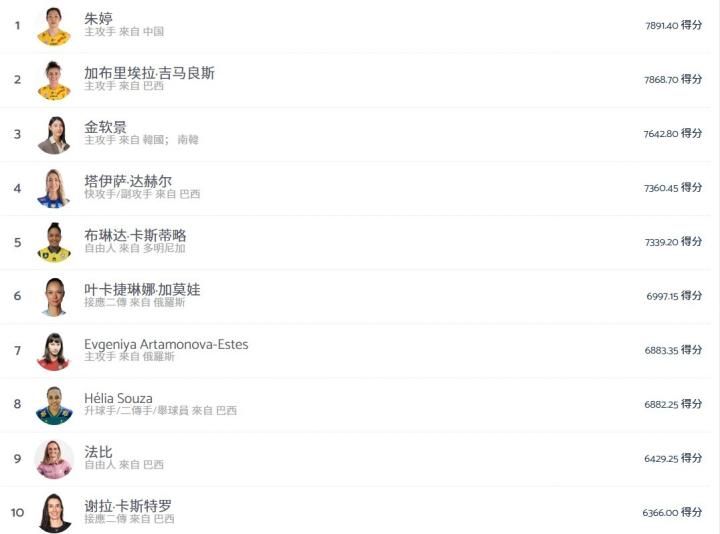 11月22日,最新一期的世界顶尖女排运动员-关于团队荣誉和个人奖项积分排名中,中国名将朱婷以7891.4分,登顶世界第一。