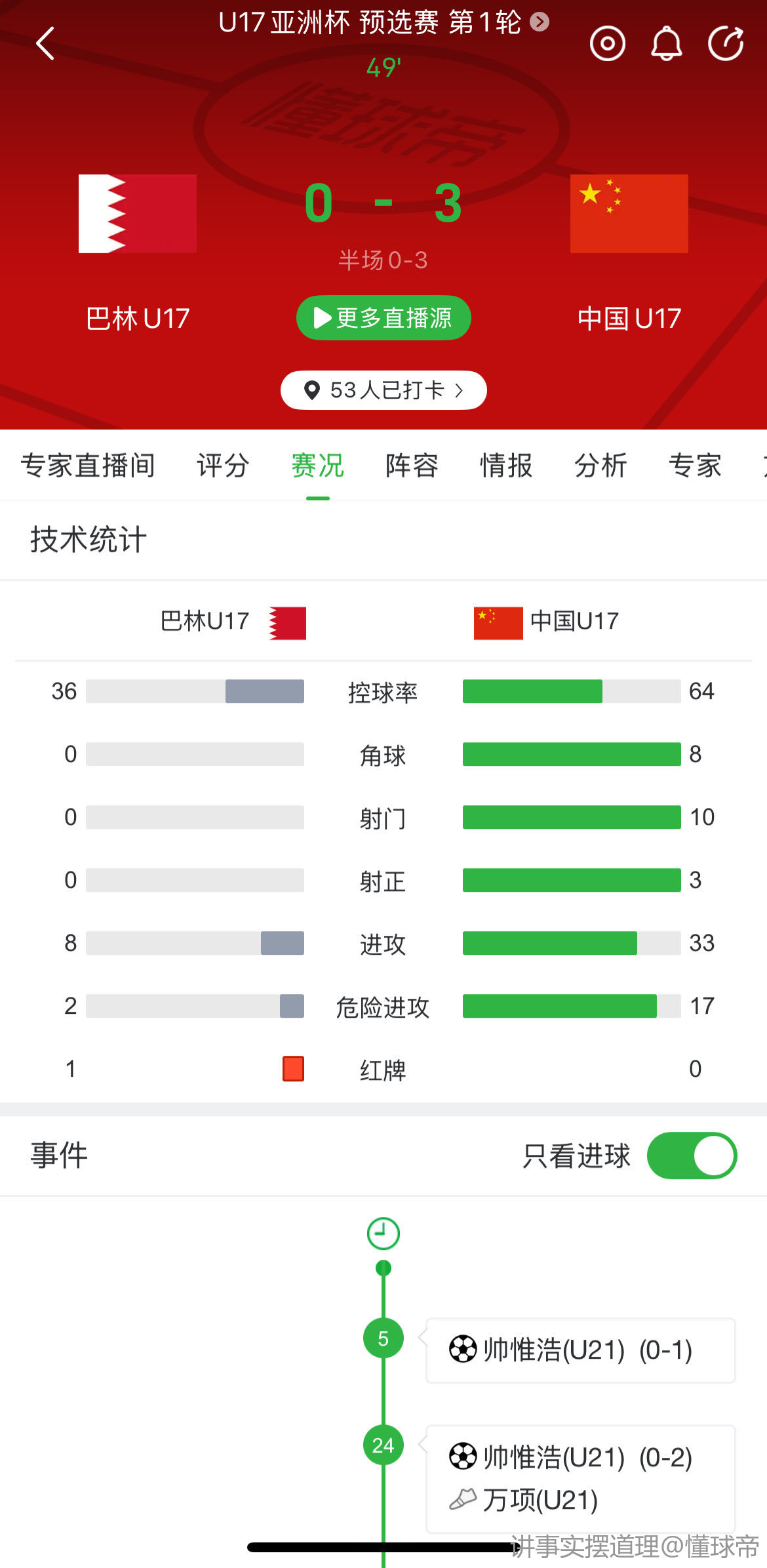 第6分钟,帅惟浩禁区跃起头球破门,中国队开场闪击1-0领先巴林