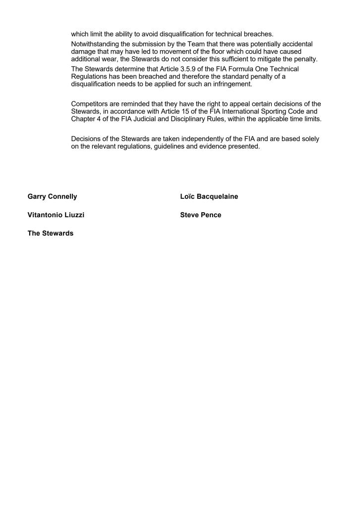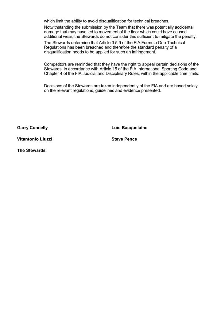为保证所有车队的赛车不使用过低的离地高度,FIA要求各车队在赛车底板加装了一个10毫米厚的复合材料板,也就是俗称的“木板”。FIA规定,该复合材料板的厚度在经历比赛的磨损后不得低于9毫米。而迈凯伦两台赛车在今天的比赛结束后,底板均被检测出不符合厚度规定。因此成绩最终被取消。