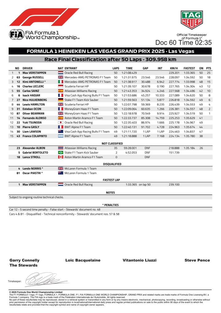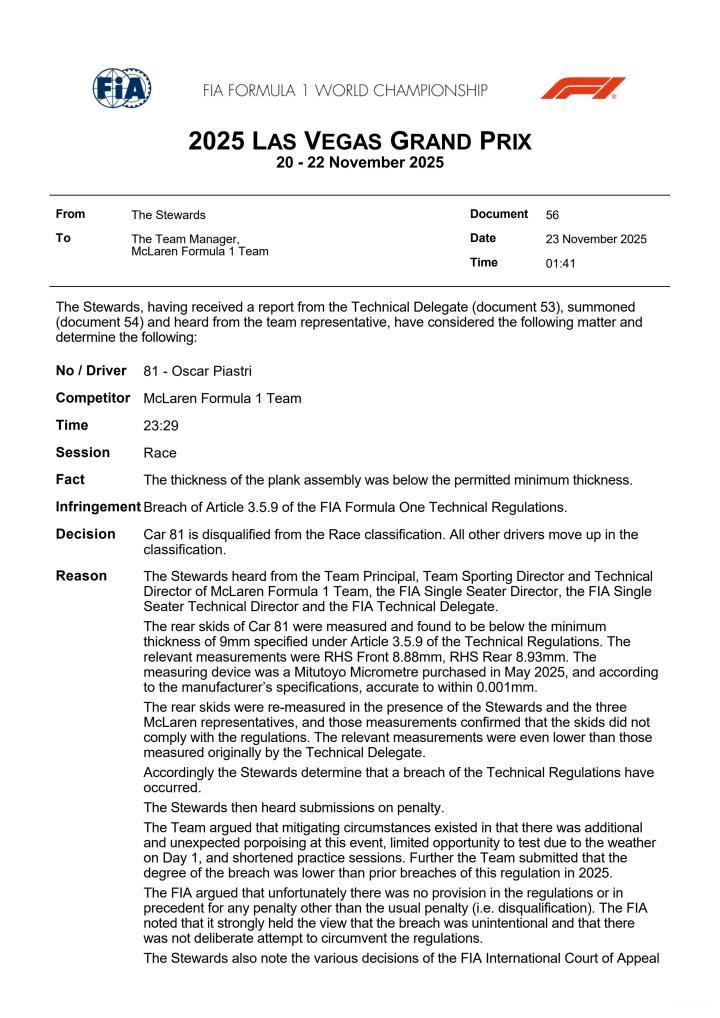 北京时间11月23日,国际汽联(FIA)发布官方公告称,迈凯伦F1车队4号及81号赛车均因底板磨损过度,被取消拉斯维加斯大奖赛正赛成绩!
