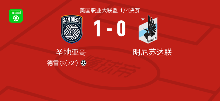 北京时间11月25日,美国职业大联盟1/4决赛展开较量,圣地亚哥坐镇主场迎战明尼苏达联。比赛中,贝尔德送出助攻,德雷尔完成破门,帮助球队取得领先。凭借这一进球,圣地亚哥以1-0战胜对手,成功晋级下一轮。