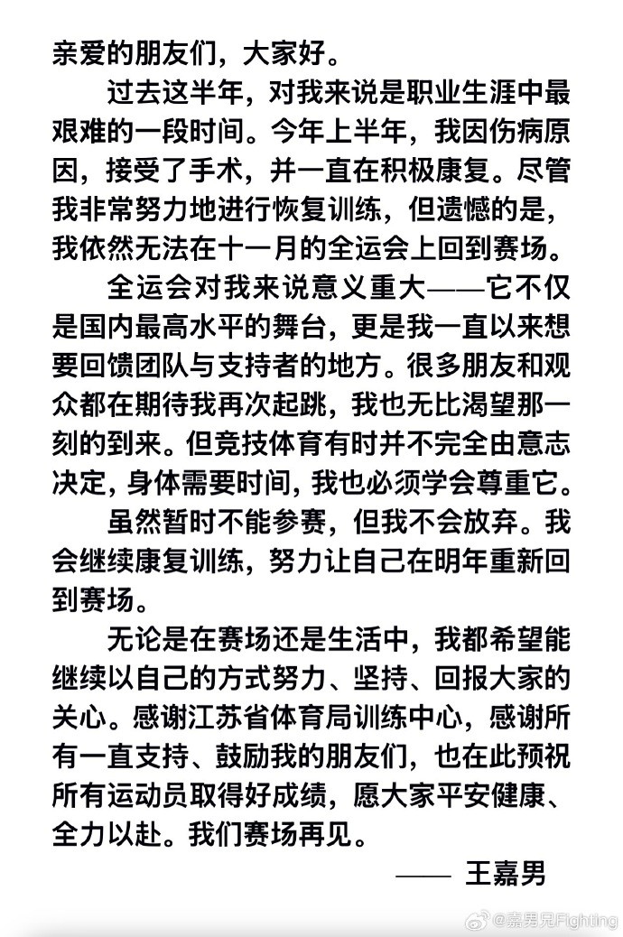 王嘉男曾在11月17日更新社媒,表示目前接受了手术,身体正在康复中。