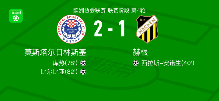 北京时间11月28日,欧洲协会联赛联赛阶段第4轮展开较量,莫斯塔尔日林斯基迎战赫根。比赛伊始,赫根球员里高-延森送出助攻,西拉斯-安诺生将球送入对方球门,帮助球队取得领先。此后,莫斯塔尔日林斯基展开反击,库热成功破门,为球队扳平比分。随后不久,比尔比亚攻入关键一球,助力球队实现反超。最终,全场比分定格为莫斯塔尔日林斯基 2-1 赫根。