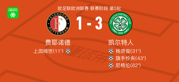 扫描下载懂球帝首页>动态> 凯尔特人3-1逆转费耶诺德,尼格伦建功,旗手怜央1传1射