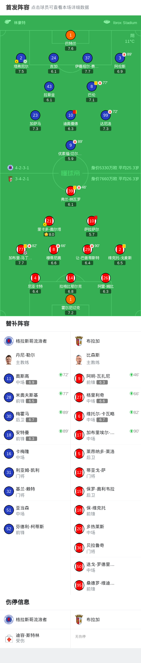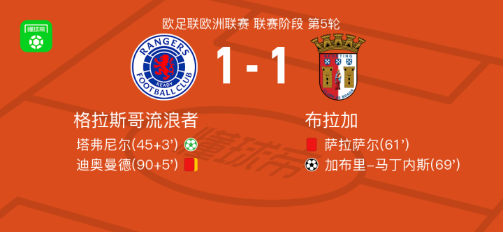 北京时间11月28日,欧足联欧洲联赛联赛阶段第5轮,格拉斯哥流浪者与布拉加上演激烈对决。上半场补时阶段,塔弗尼尔主罚点球命中,帮助球队取得领先。进入下半场,布拉加球员萨拉萨尔被红牌罚下。随后,加布里-马丁内斯抓住机会扳平比分。比赛尾声阶段,迪奥曼德累计两张黄牌被罚出场。最终双方以1比1握手言和。